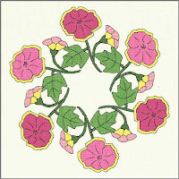 After adding the green stems and leaves I add the purple and yellow flower parts. Then I zoom in to color those tiny French knots. Here is the completed block drawing. Do you see the star shape that forms in the middle of the block? I love those surprises!!